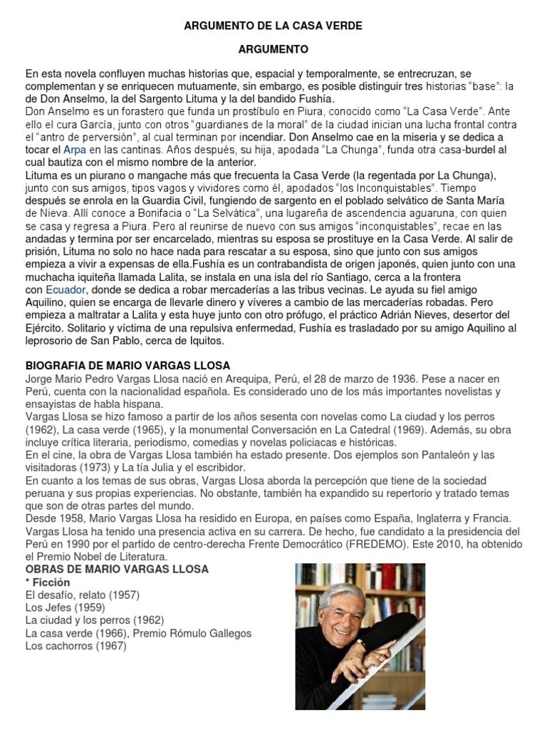 La casa verde mario vargas llosa resumen. Jorge mario pedro vargas llosa arequipa 28 de marzo de 1936 i marqués de vargas llosa 2 3 conocido como mario vargas llosa es un escritor y político peruano que cuenta también con la nacionalidad española desde 1993. La casa verde es una de las obras más conocidas por mario vargas llosa en el año 1967 se encuentra presente como su segunda creación literaria mientras que la principal fue la ciudad y los perros estrenada en 1964. Isbn 84 8280 800 1 obra completa lima peisa 2001.